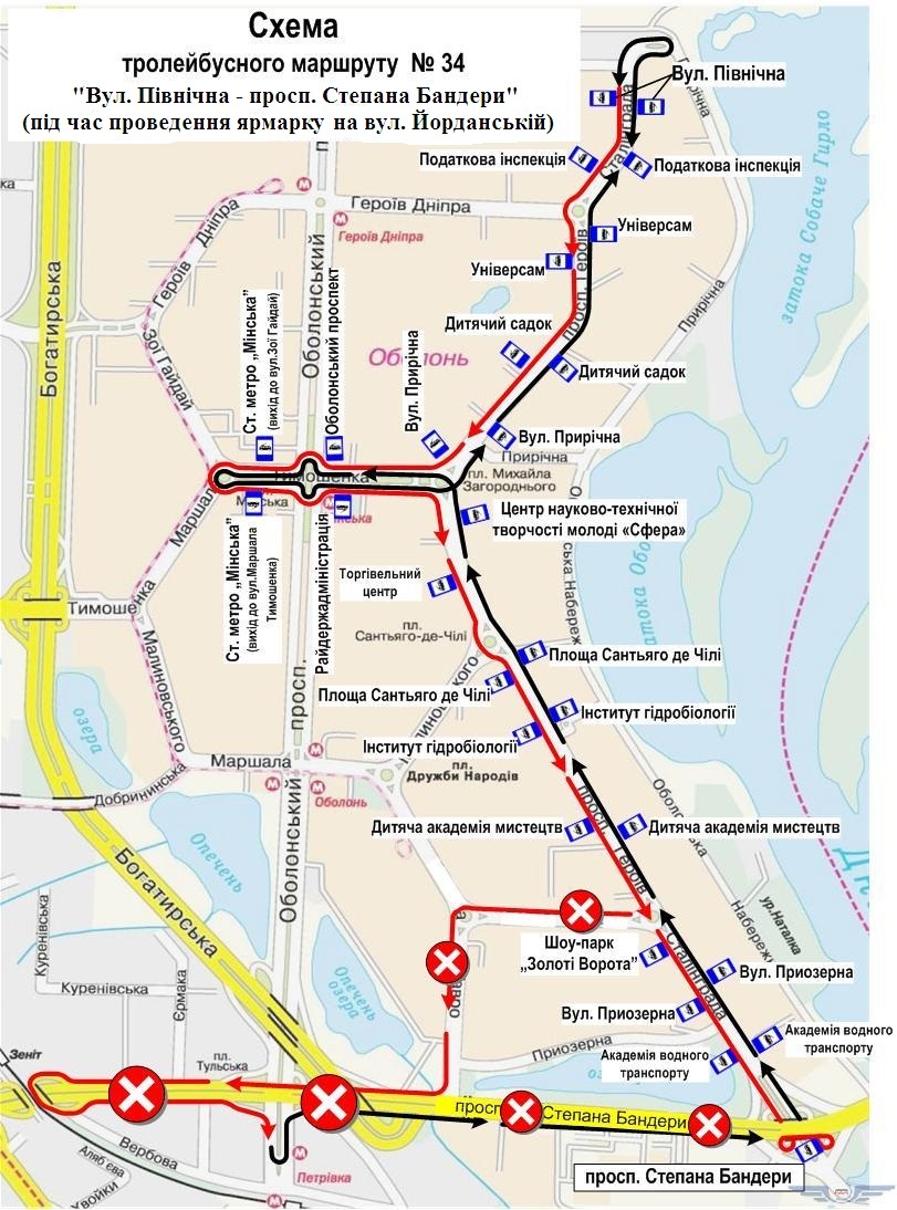 У зв’язку із проведенням 20 квітня 2019 року продовольчої ярмарки на вулиці Йорданській вносяться зміни в роботу тролейбусного маршруту № 34. Про це повідомили у КП «Київпастранс».