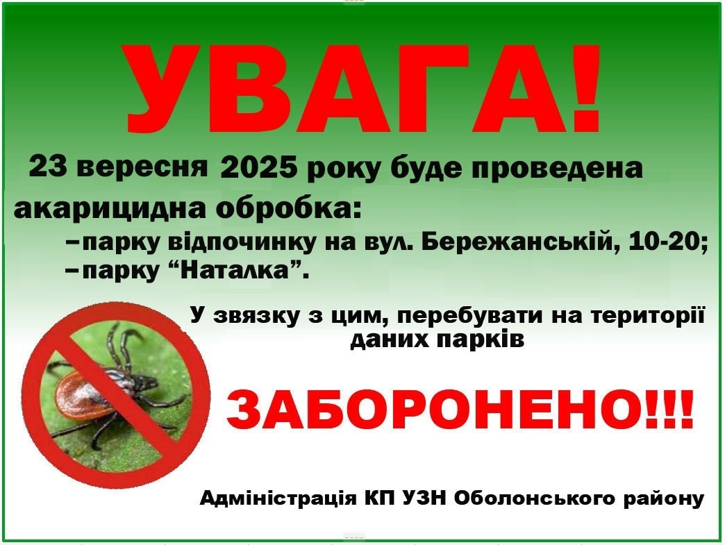 Увага! КП УЗН Оболонського району інформує, що 23.09.2025 в Оболонському районі будуть проведені заходи з акарицидної обробки наступних об'єктів:
