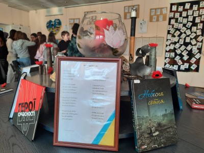В день пам'яті Героїв у бібліотеці оформлено фотовиставку "Небесна Сотня: Пам'ять та шана Героям". Світлини нагадали нам Небесних Воїнів, які загинули, але будуть жити у наших серцях. В пам'ять про загиблих прозвучав реквієм "Гей плине кача..."
