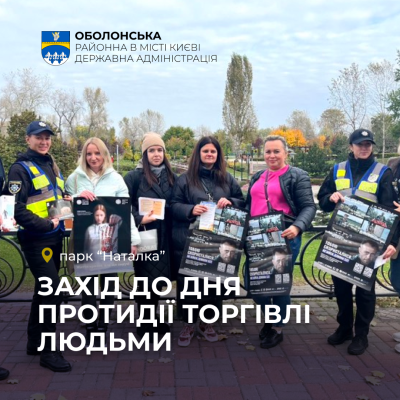 З метою підвищення рівня обізнаності населення щодо проблеми торгівлі людьми та на підтримку державної політики у сфері протидії цьому злочину, 17 жовтня 2025 року в Оболонському районі міста Києва було проведено інформаційно-просвітницькі заходи, присвячені Дню протидії торгівлі людьми в Україні.