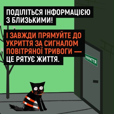 Закликаємо не нехтувати власною безпекою та безпекою рідних: завжди прямуйте до укриття після сигналу повітряної тривоги!