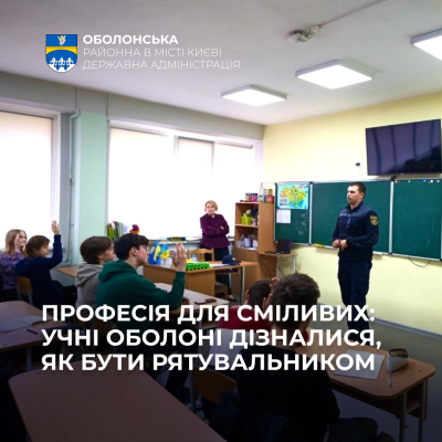 Під час спілкування учнів спепціалісти Оболонського районного управління ГУ ДСНС Україниознайомили зі специфікою служби в системі ДСНС, розповіли про роль рятувальника в сучасних умовах та можливості здобуття знань у профільних закладах вищої освіти сфери цивільного захисту. Молодь отримала інформацію щодо вступної кампанії, напрямів підготовки та перспектив подальшого проходження служби.