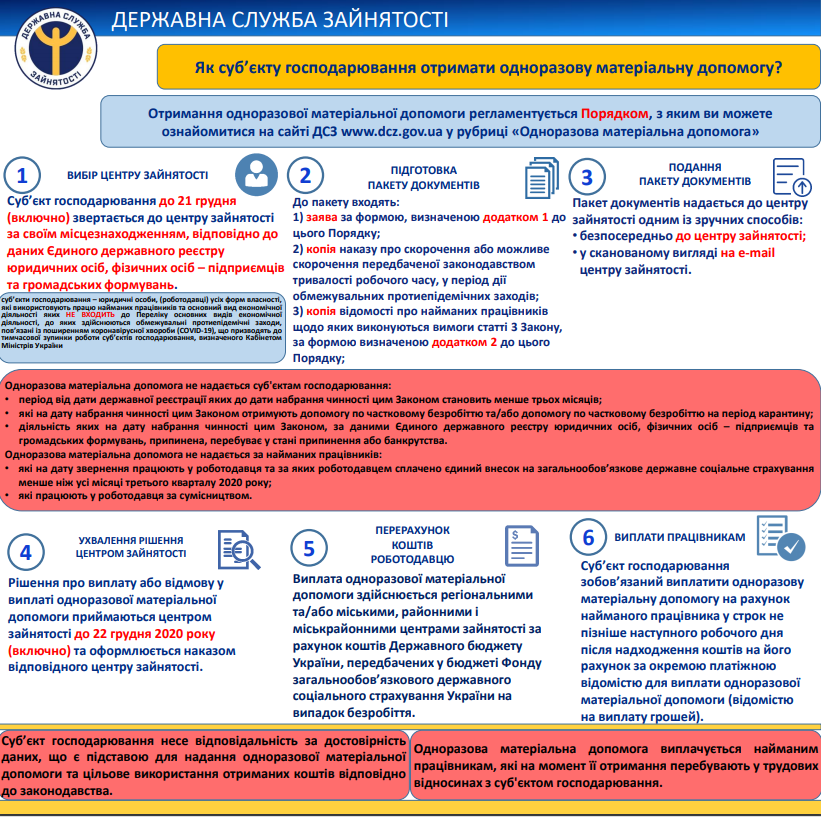 «Починаючи з 14 грудня, роботодавці, які скоротили або можуть скоротити робочий час працівників через карантинні обмеження, можуть подати заяву на отримання одноразової матеріальної допомоги. Для цього до 21 грудня їм необхідно звернутися до центру зайнятості за своїм місцем перебування та надати необхідні документи», - зауважив директор Київського міського центру зайнятості Віктор Білич.